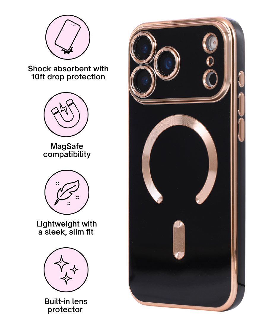 Introducing the protective Luxe MagSafe phone case, complete with rose gold detailing and a glossy finish. Built-in lens protector keeps your camera lens safe from bumps and scratches.