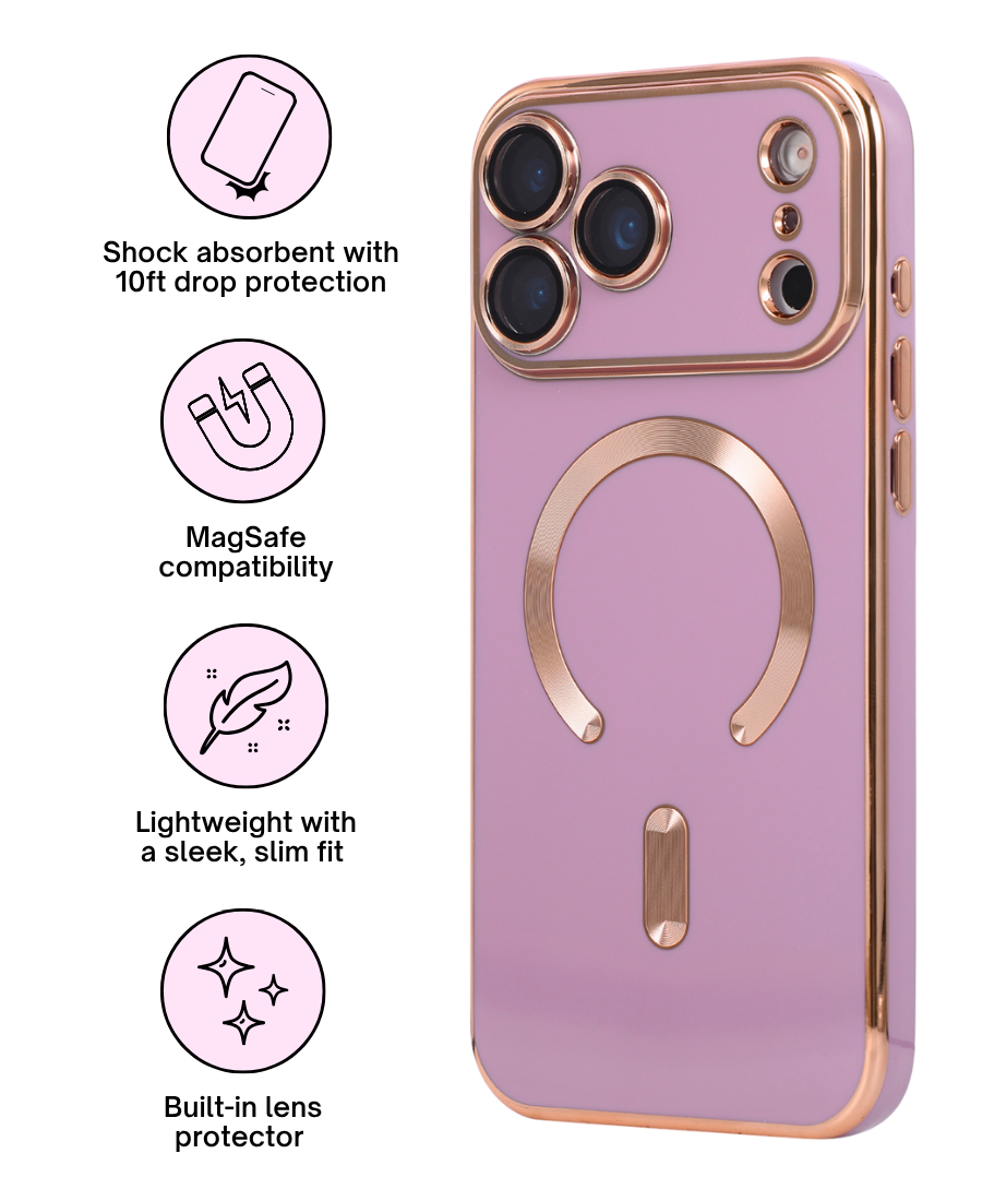 Introducing the protective Luxe MagSafe phone case, complete with rose gold detailing and a glossy finish. Built-in lens protector keeps your camera lens safe from bumps and scratches.