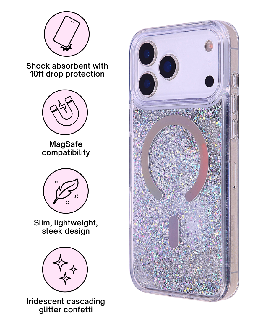 Protective MagSafe case with cascading glitter confetti that moves with you and makes a statement!